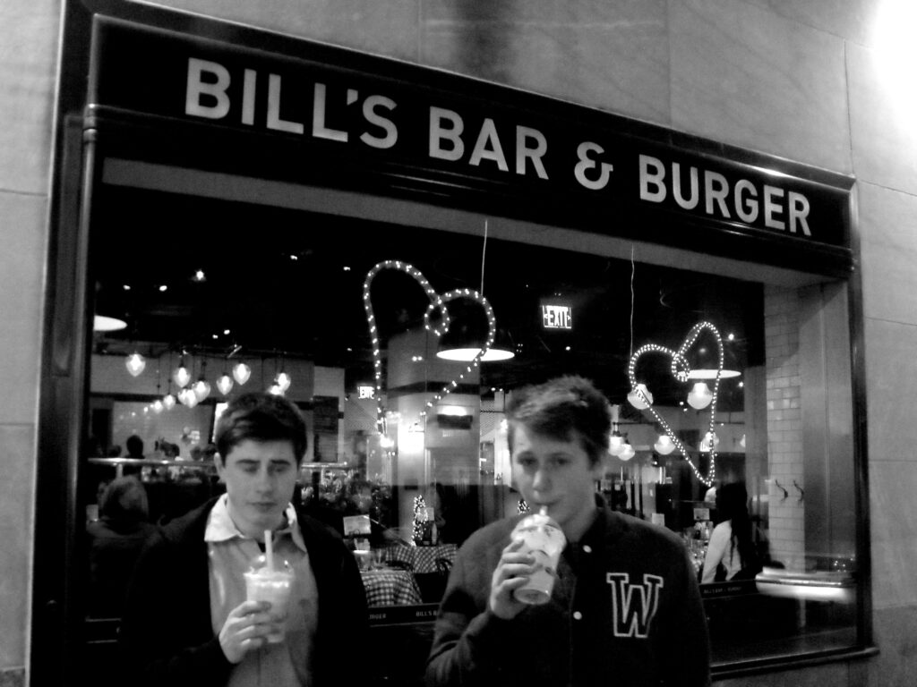 So much sight seeing requires regular refuelling and we stopped off at a particular favourite of mine: Grand Central Station. The station has the grandest roof of any rail terminus in the world – a teal green backdrop with golden depictions of the constellations of the night sky etched into the curved canopy. And underneath it is a culinary gem. The Oyster Bar. It’s a stalwart of the business lunch crowd. Cream coloured tiles, chrome bar stools, gingham paper tablecloths. It’s not smart – it’s a conveyor belt of mediocre seafood. But I like it and the boys enjoyed it, too.