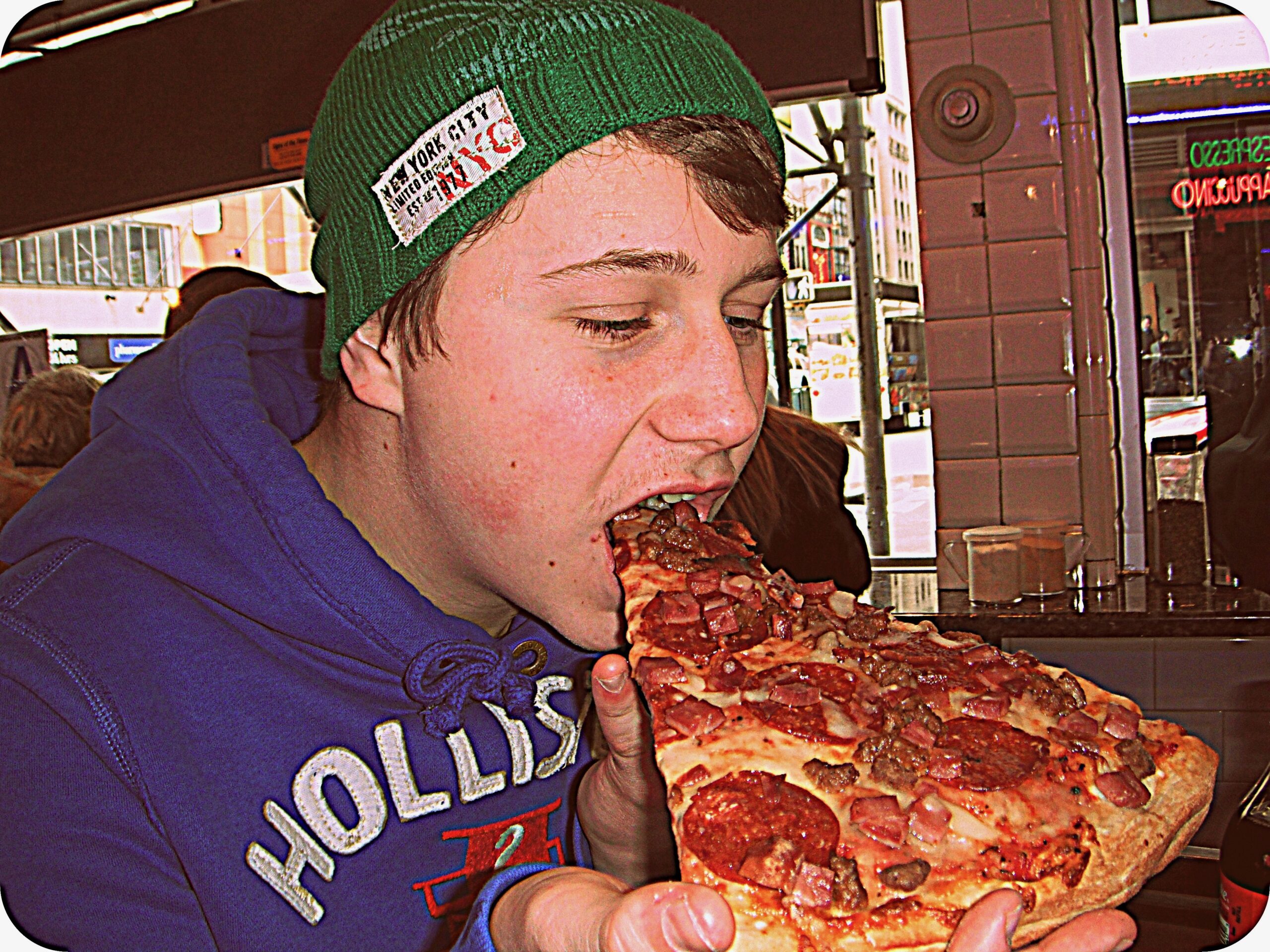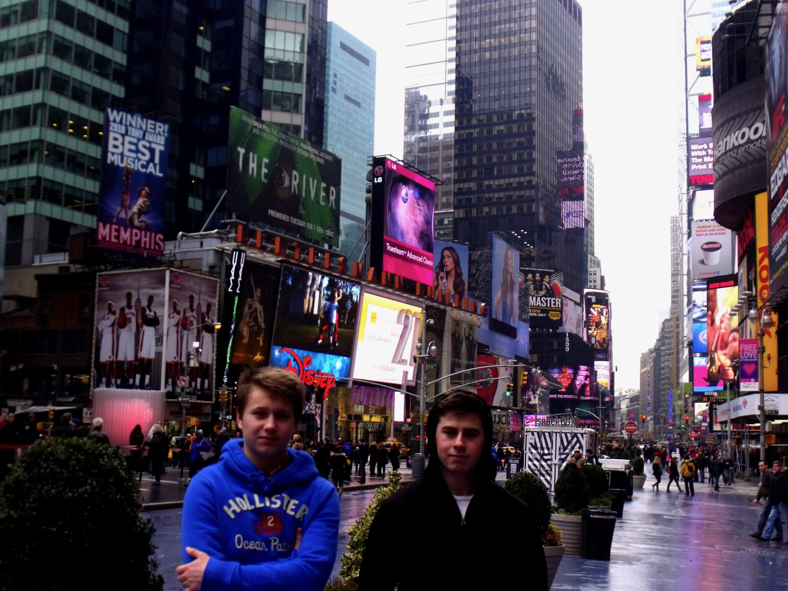 First trip to New York. You have to do the sights. The boys wanted to orientate themselves so we settled into our cavernous room – two emperor sized beds, big TV, marble bathroom and view of the glass and concrete canyons that make up the Midtown district – unpacked and went down onto street level. We walked over to Time Square, which, as we all know, is a hole and a cliché, but it had to be done. We popped into the American Eagle store for our first of what was to be many excursions into the clothes outlets of all New York. I guess that everyone, whether from Kansas or Kensington, Kyoto or Kuala Lumpur, is bowled over and has to pinch themselves when walking the streets of Manhattan. Everything is so familiar and yet so alien. So quintessentially NYC. The yellow taxi cabs, the long, straight avenues and streets with their uniform coloured traffic lights. The steam pouring out of the manhole covers from the subway. The most famous buildings in the world. It’s lovely to view it all afresh through the starry eyed gaze of your awestruck teenage children.
