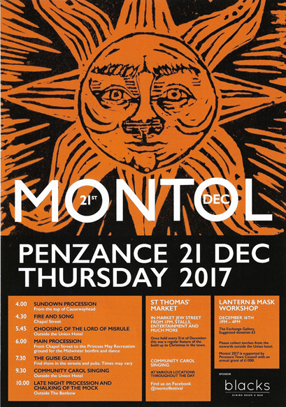 Montol is held on the 21st of December each year since 2007. The festival is a revival or reinterpretation of many of the traditional Cornish midwinter customs & Christmas traditions formerly practiced in and around the Penzance area and common to much of Cornwall at one point. Montol is held on the traditional date of the feast of St Thomas the Apostle, usually the 21st of December, which always coincides with the winter solstice.