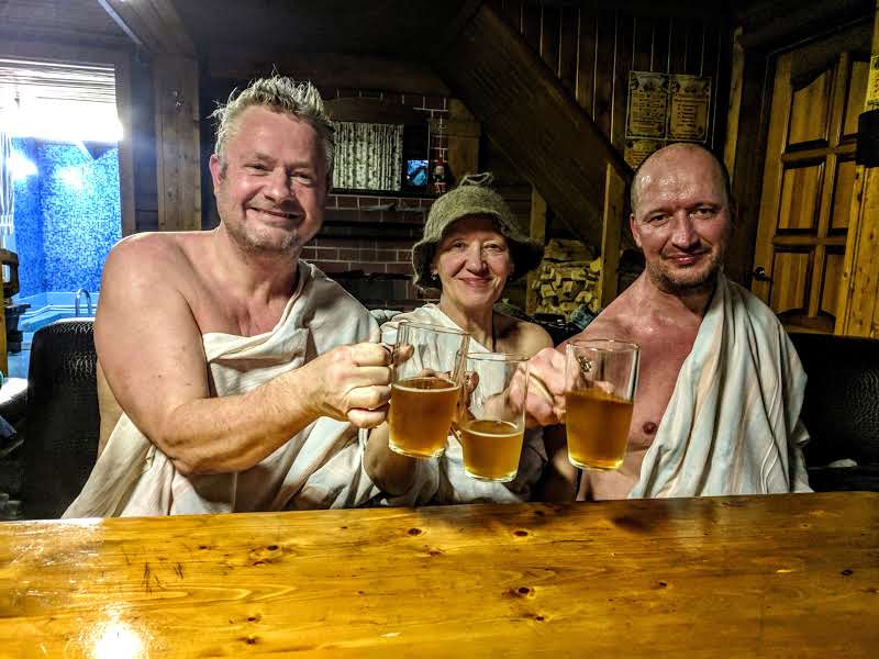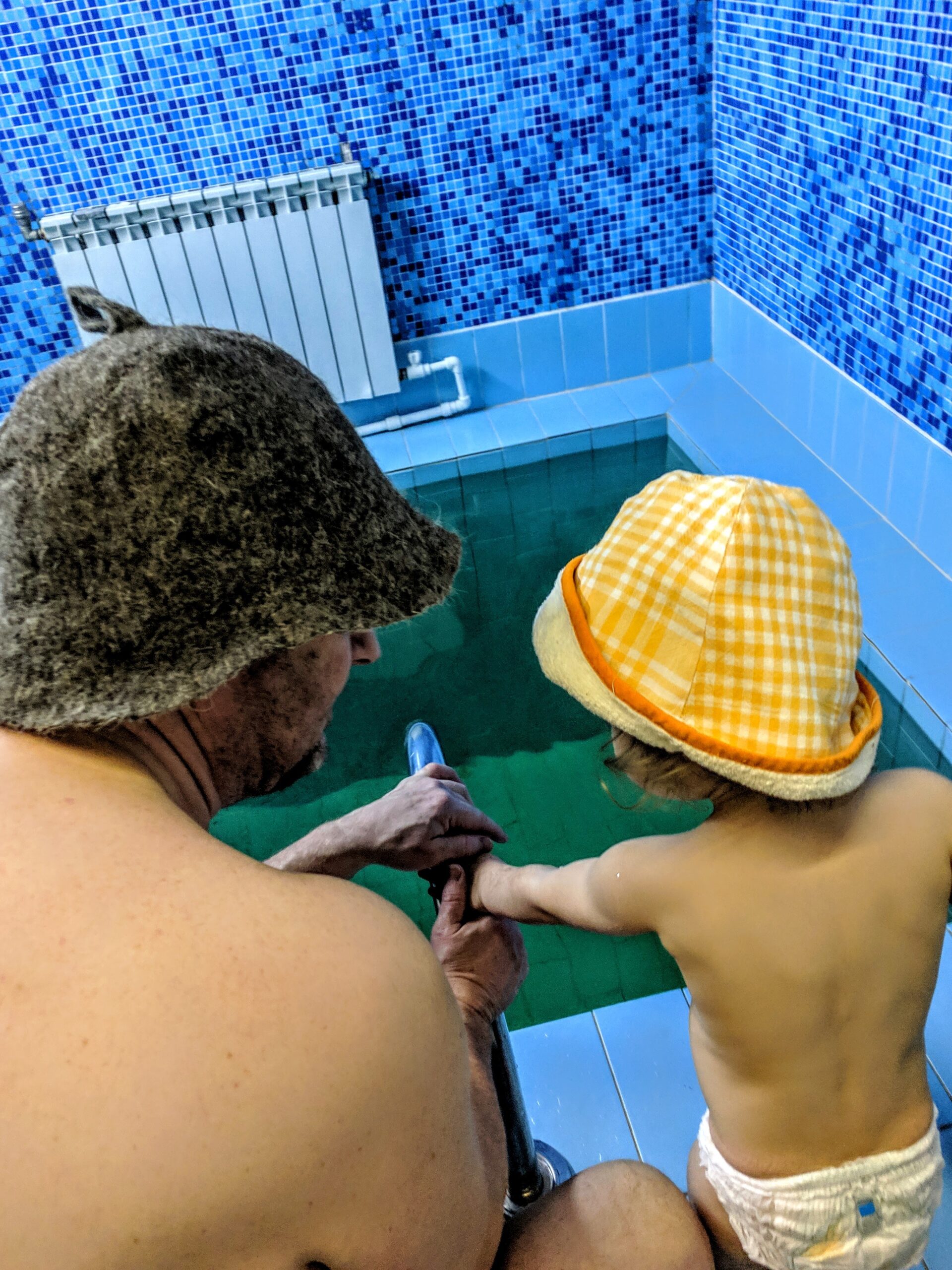 My daughter being inducted into the ways of the banya Birch twigs waft the scalding air into your aching bones Timur stokes the furnace I rub snow into my body in the middle of a Russian winter Time for talking