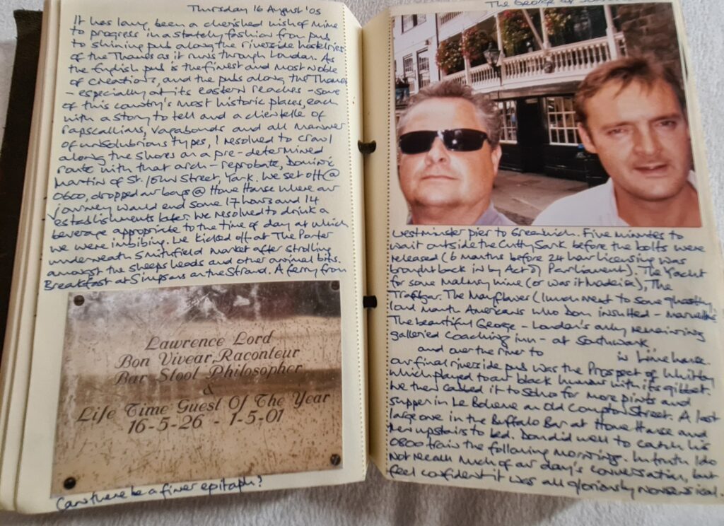 Borough Market and the only Georgian galleried Inn left in London, The George. Another pint. Across the Bridge and another cab ride to Wapping and the notorious pubs of that manor: the Prospect of Whitby, the Grapes in Limehouse, the Captain Kidd, Turner’s Old Star. By now we are quite merry. To Soho and the Crown and Chairman. Some other pubs. A green doored Speakeasy I couldn’t ever find again but which Dom seemed to know the secret password for. And back to the bar at Home House, where we were sharing a bed, Laurel and Hardy style, for the night. Twenty one establishments. And Dom was up and fit as a flea in time to catch the 0720 from King’s Cross. Outstanding behaviour.
