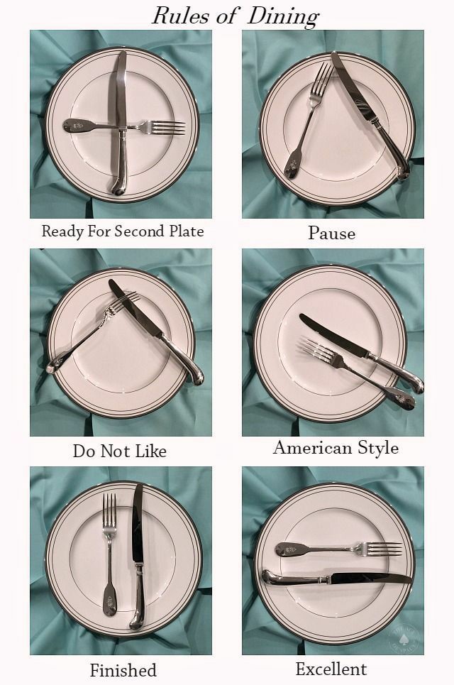 “The cutlery is arranged in logical order: start on the outside and work inwards with every course. Your side plate is on the left. Hers is to your right. Don’t touch it. Now, the glasses.This one is for water, this for white wine, this for red. With me so far?”