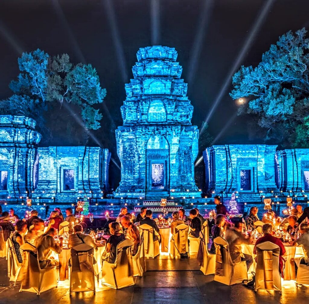 Cambodia. A fleet of tuk-tuks have just ferried five hundred people into the jungle from the swankiest hotels in Siem Reap. I am jet lagged but high on the spectacle. The tuk-tuks drop the guests off at the entrance to an ancient Khmer temple which has been almost completely subsumed into the jungle. At the place of disembarkation, carefully choreographed members of the Royal Cambodian Ballet are placed on plinths and half ruined columns in full costume. The blue monkey God strikes a classical pose – he is strikingly magnificent.