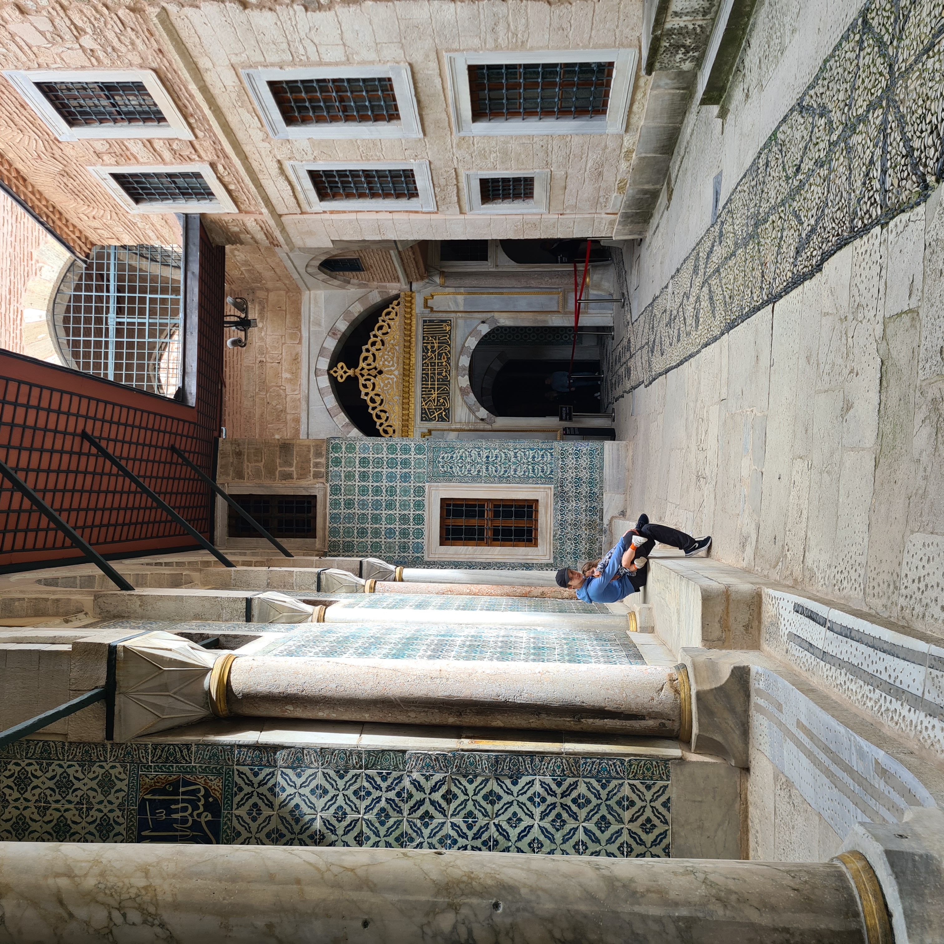‘Wow’ is the word that sprang from Josh’s lips as we entered this vast space. It was the largest building in the world for 800 years of its history and has presided over so much during its lifetime as a cathedral, a mosque and a museum. Whereas the last time I was inside it was a fully marble floor and the mosaics of Christ and the angels were on full display (even though the building inside felt rather empty and unkempt), now it is a working mosque, it is carpeted and the mosaics are semi covered up with large sheet screens. The screens cover the iconography when muslims are at prayer but are partially visible when it returns to a tourist destination. It is magnificent. Awe inspiring and we sit on the carpet to soak it all in. There is only one part of the original floor uncovered by carpet now, the fabled centre of the world.