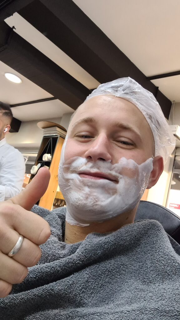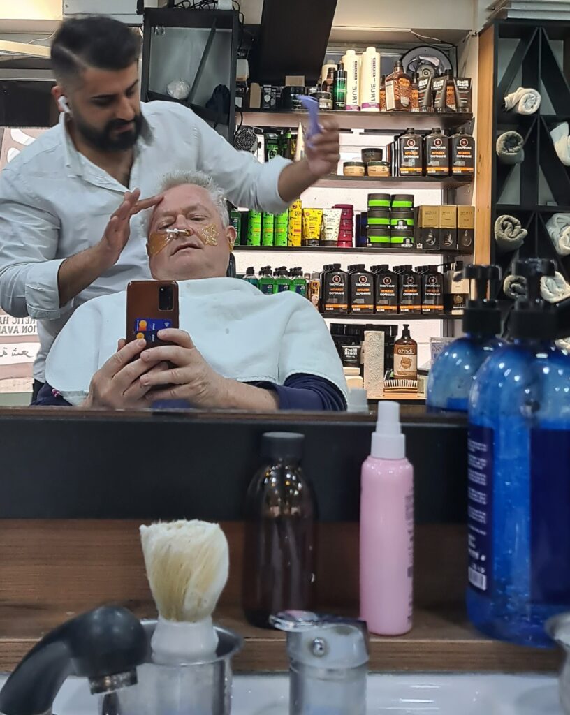 I looked over at Josh. He was wearing some sort of face mask made of black clay which made him look like a home made version of the Batman. He was lathered in shaving soap and had a plastic bath cap on his head. This was the full monty treatment. I left Josh to his treat and joined the others for a coffee. Twenty minutes later, Josh emerged, coiffed and looking freshly gorgeous. The difference was noticeable and both Josh and Katy seemed impressed with the result. Sadly, it didn’t take decades off my appearance but at least we were shaved and ready for action.