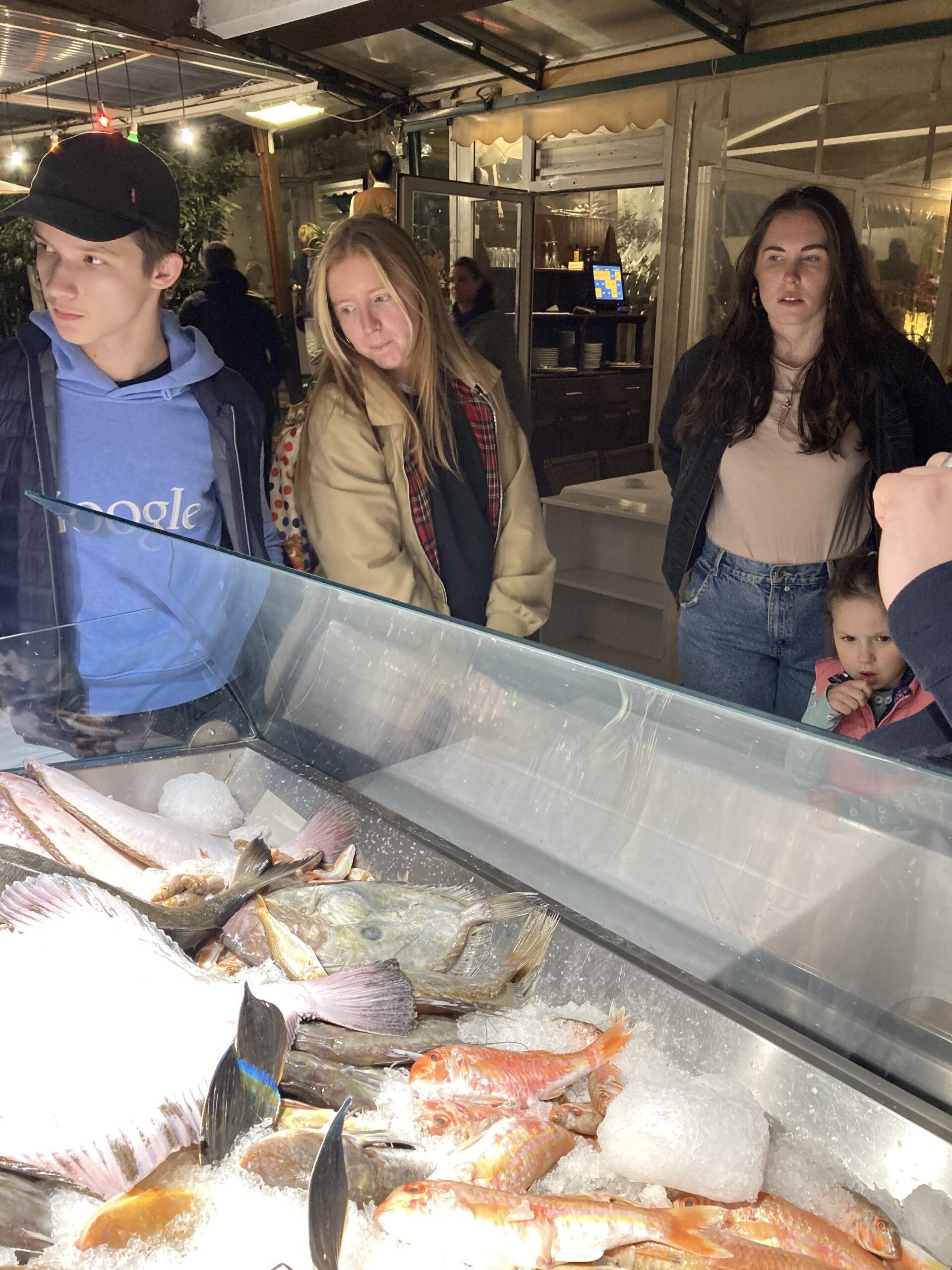 When we emerged it was raining hard. Katy had a recommendation for a Greek restaurant over near the area we had eaten in two nights ago at the fish restaurant. Bravely she led the way with a complaining me but when we got there it was so worth it. Greeted as always by another hospitably- natured proprietor, the dining room upstairs was like a Greek grandmother’s sitting room. The decor was traditional with an ornate chandelier centre stage, white walls, green and brown painted decoration and oil paintings of bucolic scenes hung in gold frames. The menu was easy to navigate and the local white Chardonnay very quaffable. So much so that between four of us we downed three bottles very easily. It was a lovely last night together and I made a toast to the Centre of Our World – to the children.