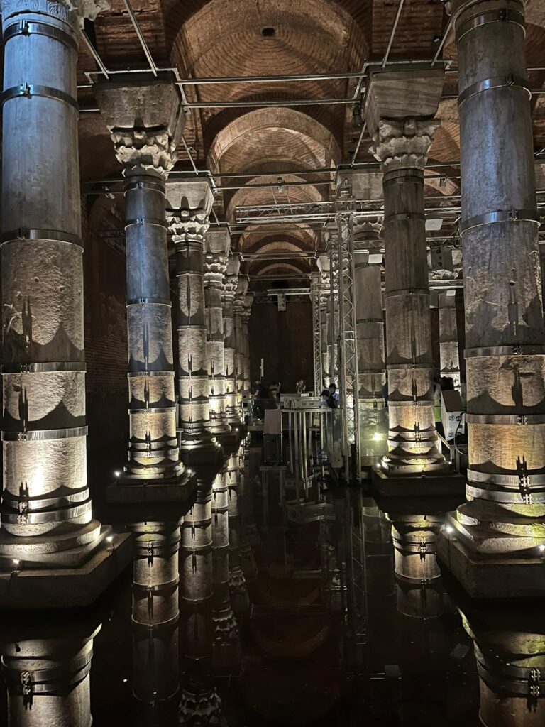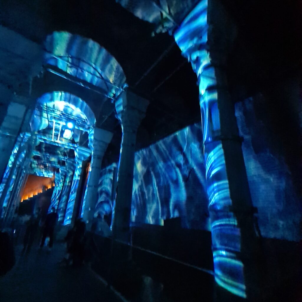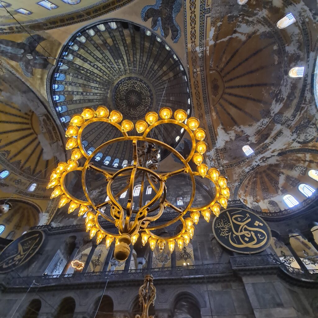 To the old Byzantine water cistern. Not the one with the Medusa’s head at the bottom of the pillar, which I have seen on past visits, because that is closed for restoration, but a smaller one. The light show happens every hour and is an impressive son et lumiere which projects images all around the underground space to show the emperor Justinian, Mustafa Kamal Atatürk, the Turkish flag (which got a round of applause from the locals) as well as three D style projections which made the space appear larger with virtual columns receding into the far distance. And from here to the piece de resistance: the Hagia Sofia.