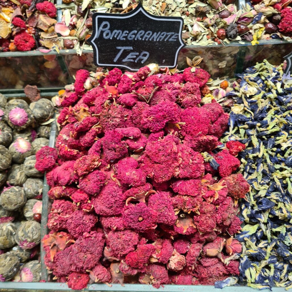 Pomegranate tea Jasmin tea Istanbul Bazaar Buying lokum and tea in the spice market Street food – roasted chestnuts & corn Galata juice stall