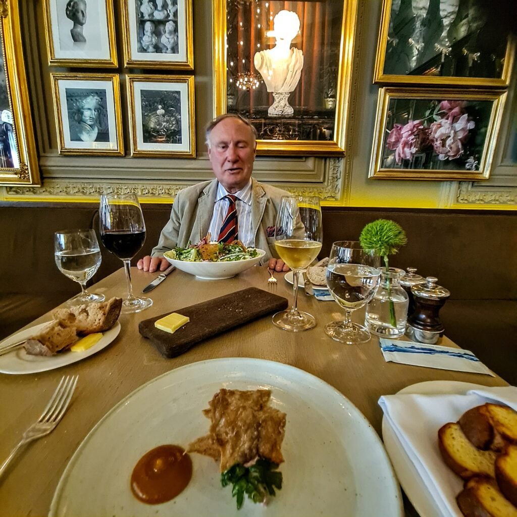 The food came and went. The service was a tad overly solicitous but fine and there was a funny disparity in the relative size of our portions: Jeffery received his gargantuan starter – a salad as large as Waitrose’s entire produce section – as I was handed what looked like an infant’s scoop of ice cream and an alfalfa sprig adrift on a sea of white porcelain. It was actually duck terrine and delicious, but he had Cavalier helpings and I, Roundhead. Fitting given that I am a Republican and he a Royalist. (Jeffery generously offered to tell the authorities to cut me down from the scaffold should my traitorous beliefs catch up with me.) We parted having enjoyed our time tremendously and four decades will not go by before our next meeting. There is too much fun to be had. And too much personal history to be both relived and made.