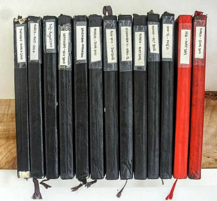 When you see two notebooks, a pristine new one and the scuff edged old one, which are you drawn to? The filled notebook is bursting with life – experiences, deeds and thoughts at a particular time. They may be full of mundanity or of scandal. They may contain secrets or opinions not to be shared but which one feels compelled to set down on paper. Notebooks provide confessional solace – salvation for those of us who cannot find a state of grace in a priest. Conversely, the new notebook, unwritten and virgin, is full of potential. Full of the blank pages of a life yet to be lived, a story yet to be told. Both are magnificent creations, but having set most of my own life down on paper and being a lover of stories, I am drawn to the filled notebook. There is something of the magical about coming across a handwritten diary, bursting at the seams with slips of paper, old tickets and letters. What secrets will it contain? Will it have occult properties and bleed if you thrust a dagger into it? Notebooks are intriguing and weighty with import.